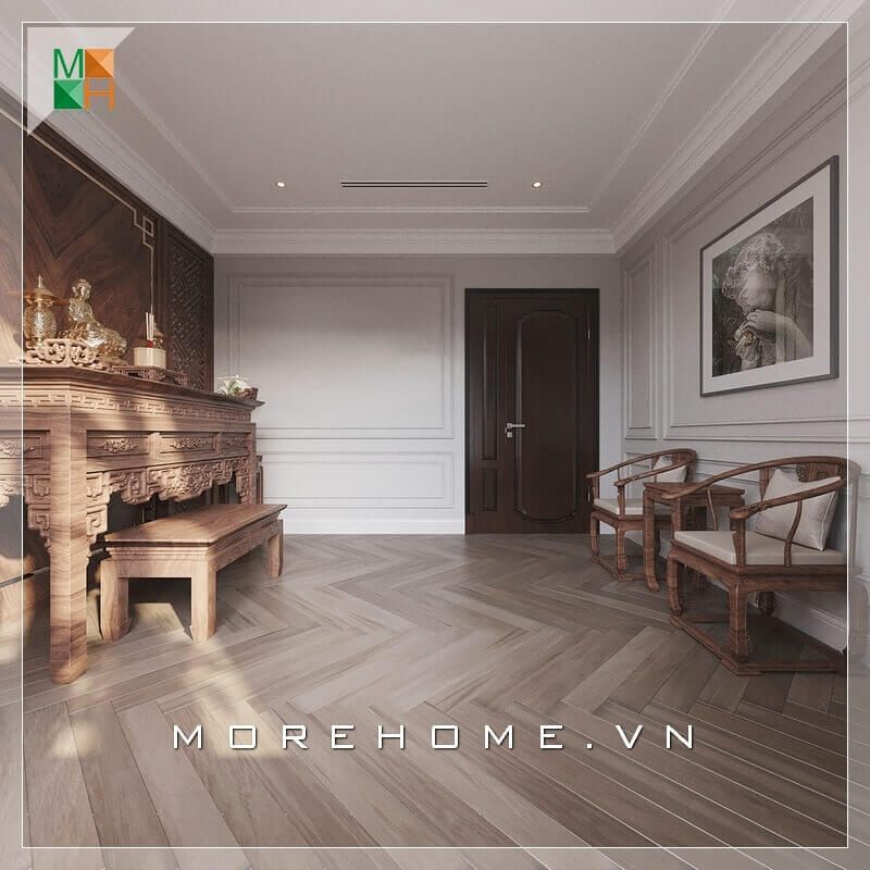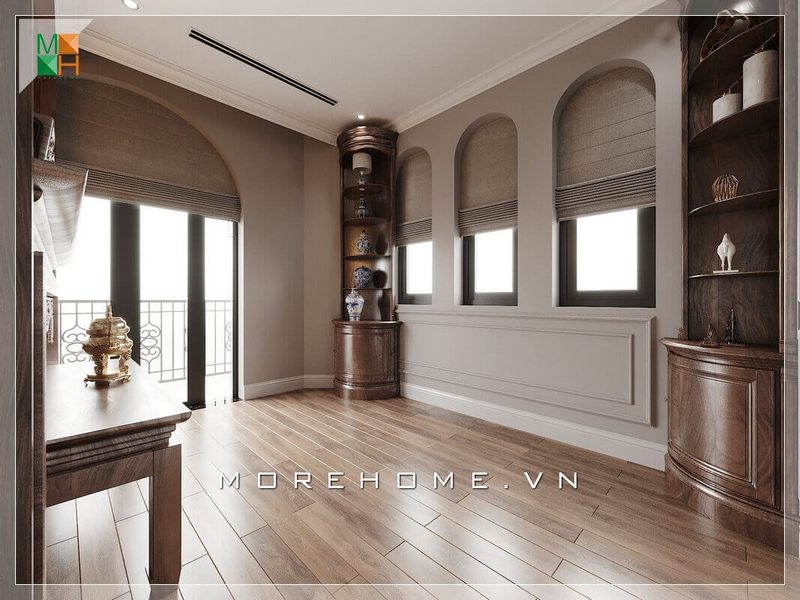 Chất liệu chính căn phòng thờ là gỗ óc chó tự nhiên cao cấp, sàn lát gỗ làm tăng sự sang trọng và sự đầu tư của gia chủ vào không gian nơi đây.