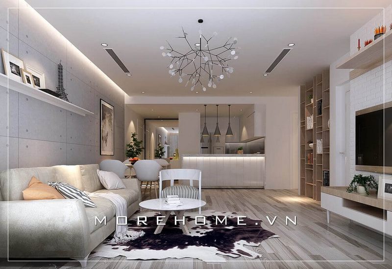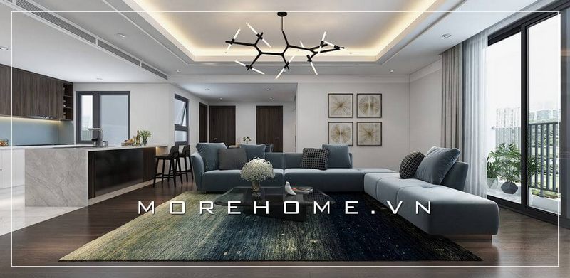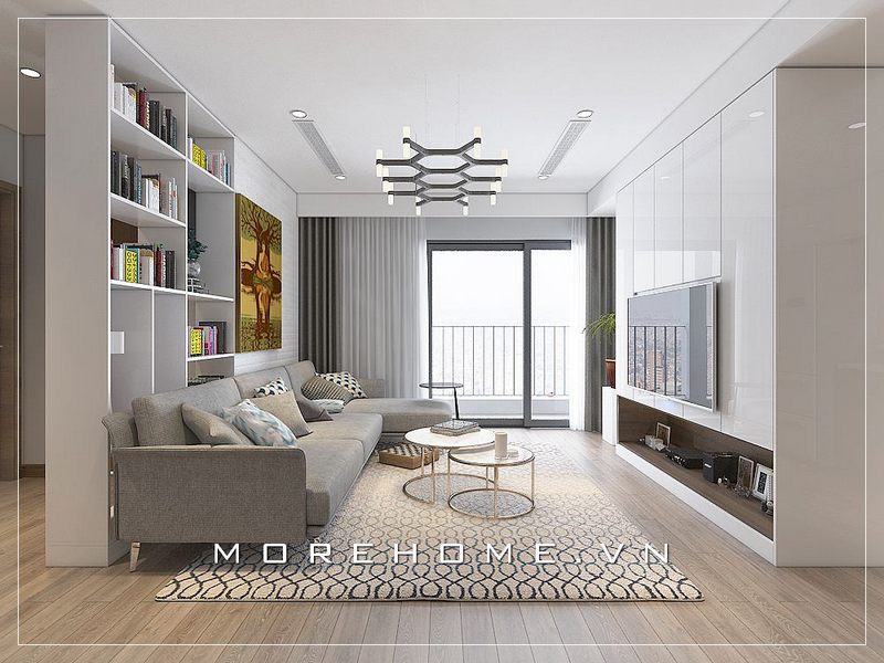Tối ưu không gian phòng khách căn hộ chung cư hiện đại với thiết kế sofa góc tiện lợi tinh tế từ sắc xám của vải bọc êm ái đầy thu hút.