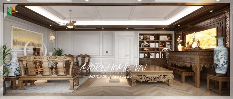 Kệ tủ âm tường gỗ chó giúp căn phòng được ngăn nắp gọn gàng trưng bày trang trí thêm cho không gian phòng thờ.