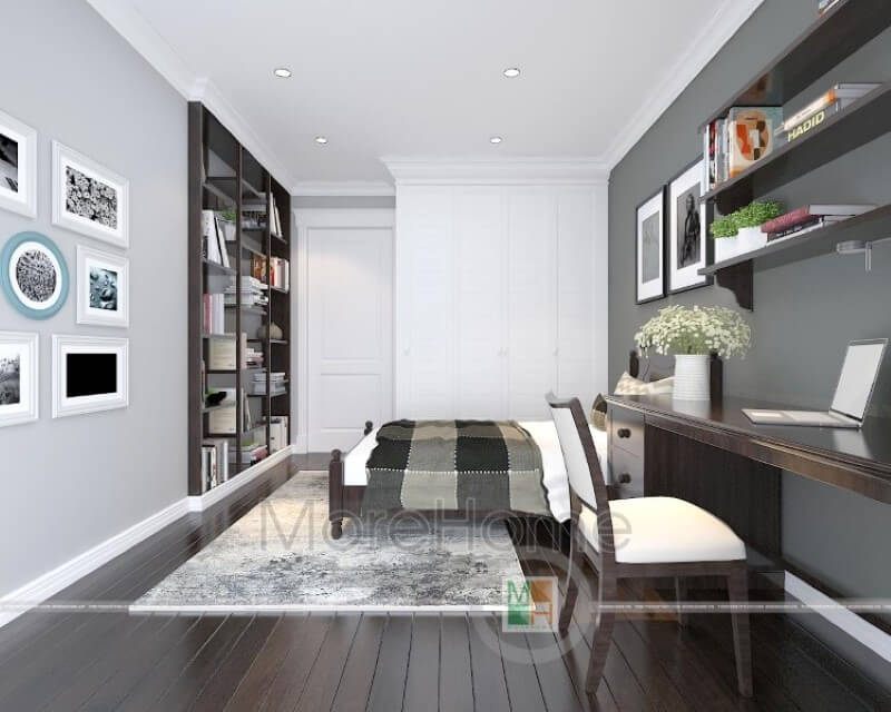 Bàn làm việc được thiết kế sáng tạo đặt ngay đầu giường kết hợp với kệ tủ đựng đồ tạo sự thuận tiện hơn cho người sử dụng