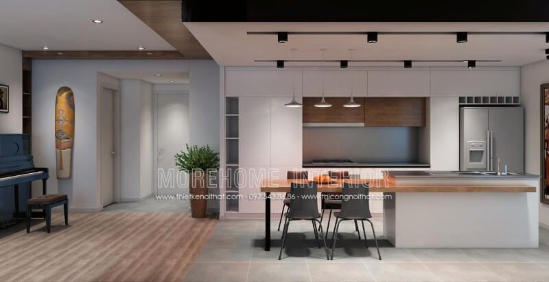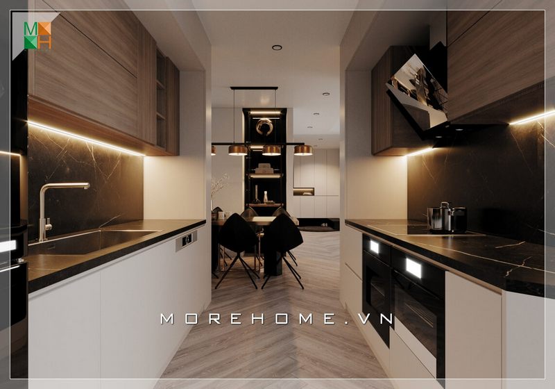 Mẫu thiết kế phòng bếp với nội thất gỗ công nghiệp kiểu dáng hiện đại sang trọng, phù hợp với chung cư có diện tích vừa và nhỏ