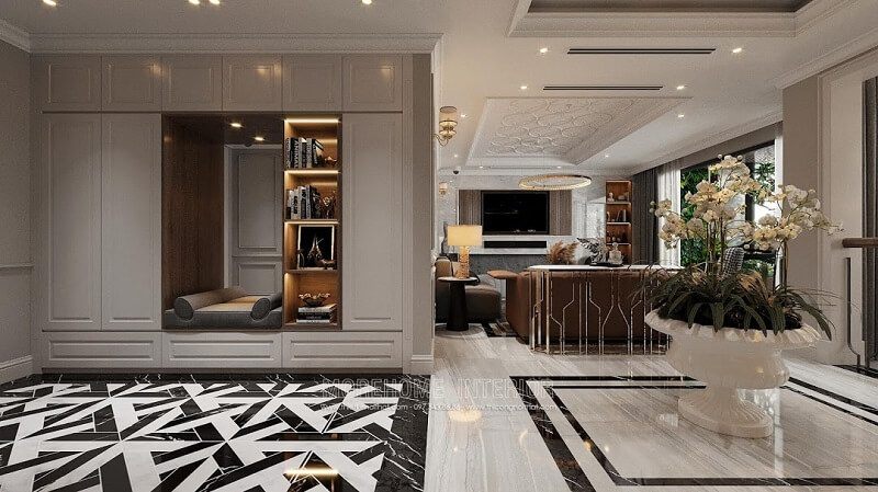 Kệ tủ tivi với kiểu dáng tân cổ điển mang đến sự sang trọng và ấn tượng cho không gian phòng khách.