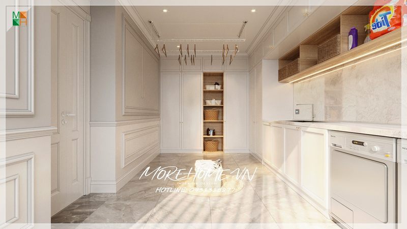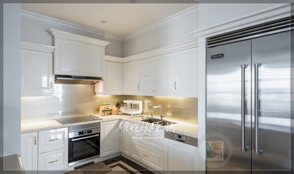 Tủ bếp tông màu trắng nhẹ nhàng nhưng không kém phần sang trọng.