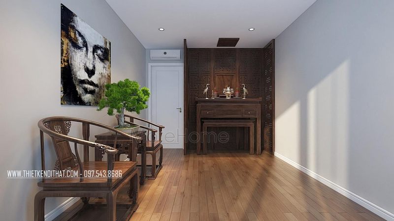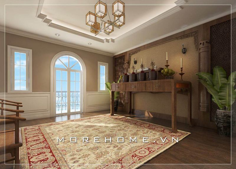 Mẫu bàn thờ gia tiên gỗ tự nhiên với kiểu dáng độc đáo mang đến vẻ đẹp sang trọng cho không gian phòng thờ