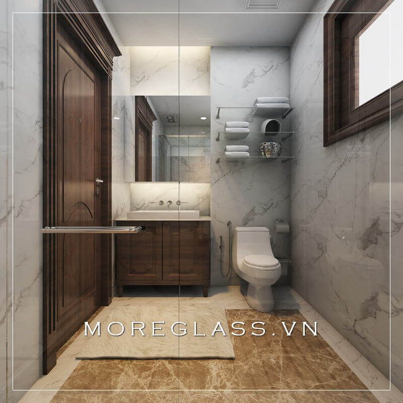 Mẫu thiết kế nhà vệ sinh và nhà tắm biệt thư cao cấp với tường ốp đá tự nhiên màu trắng vân mây sang trọng, đẳng cấp.