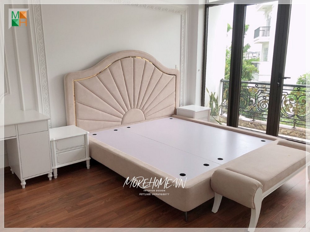 Mẫu giường ngủ bọc nỉ sang trọng, khung gỗ tự nhiên phun sơn trắng với đường nét chạm khắc tinh tế tạo sự nổi bật cho cả căn phòng