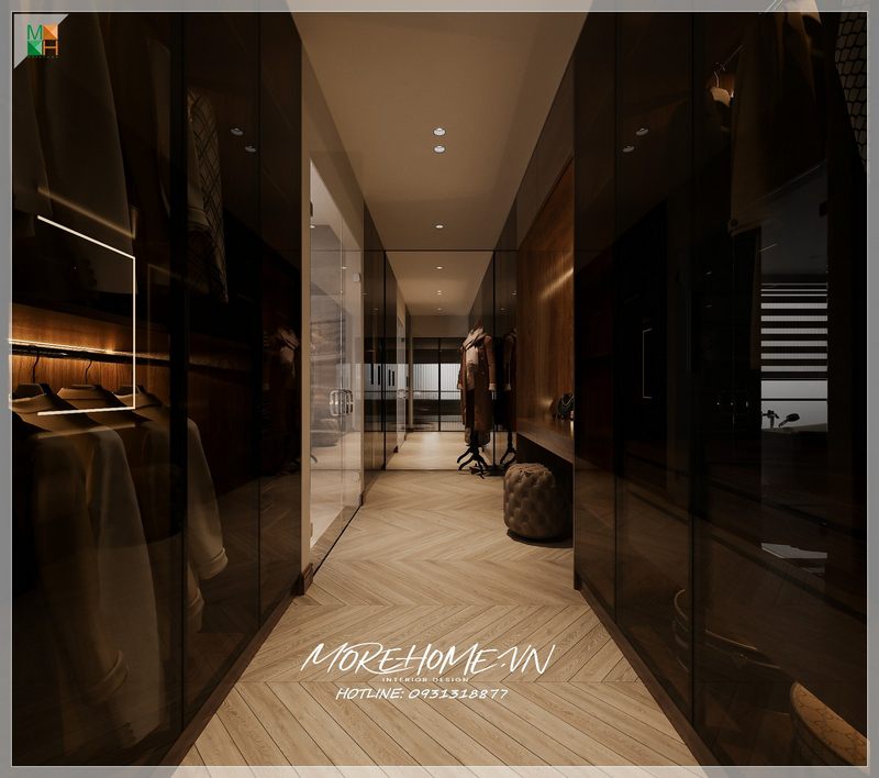 Tủ quần áo gỗ kết hợp cánh kính cường lực mang đến cho gia chủ một không gian phòng ngủ chung cư sang trọng