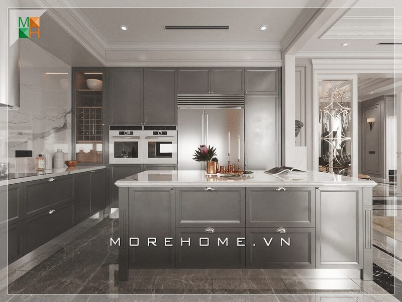 Mẫu tủ gỗ thiết kế âm tường và đảo bếp tiện nghi sang trọng đầy đủ nội thất giúp căn phòng bếp trở nên sang trọng và đẳng cấp.