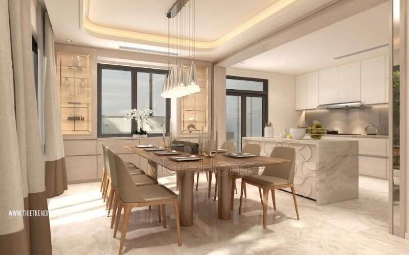 Để tạo ra sự tiện nghi nhất cho người sử dụng, thiết kế nội thất phòng ăn của biệt thự hiện đại phải được liên kết với khu vực nhà bếp.