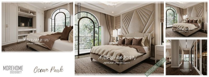 Phòng ngủ của vợ chồng hiện đại, đẹp, sang trọng, thông thoáng với hệ cửa kính lớn luôn cho phép ánh nắng vào nhà, nhưng vẫn có thể giúp ngăn nóng bằng rèm 2 lớp.