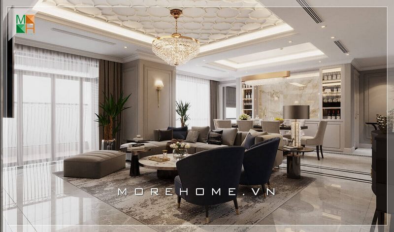 Căn hộ chung cư sang trọng cao cấp với bộ sofa bọc nỉ sang trọng thiết kế phóng khoáng rộng rãi. Bộ sofa tone màu hài hòa với sàn nhà được thiết kế sang trọng và cao cấp tạo nên điểm nhấn ấn tượng của phong cách thiết kế phòng khách cổ điển hài hoà và kiến tạo không gian phòng khách lịch sự.